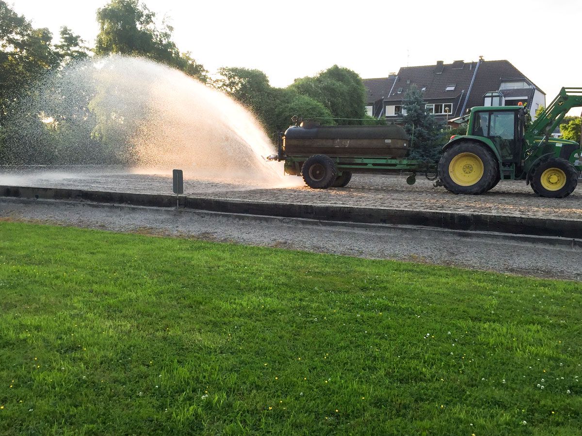 Unser Dressurviereck ist ganzjährig bereitbar und durch Flutlicht bestens ausgestattet. Der Hallenboden von der Firma Stresan ist mit seinem eingearbeiteten Flies immer ideal auf die Bedürfnisse unserer Vierbeiner abgestimmt. Eine regelmäßige Bewässerung aller Anlagen ist selbstverständlich.